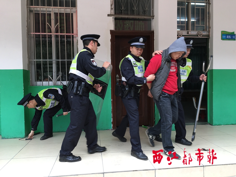 ????活動現場還進行了校園防恐防暴應急演練,由兩名特警隊員扮演的持刀男子沖進校園企圖行兇,門衛保安立即吹哨、敲響防暴反恐警鐘,并拿起值班室外的防暴鋼叉和木棍阻止兩名男子沖入操場。在持刀男子與門衛保安對峙過程中,體育老師撥打了110電話,振興小學護校隊的青年教師手持防暴器械迅速趕到,將兩名持刀男子團團圍住。在操場上上體育課的同學們在老師的帶領下,迅速從不同路線有序“逃進”教室。師生們馬上關緊門窗,并用桌椅堵住教室門,嚴防“歹徒”破門而入。在一片混亂之時,萬秀區警務大隊特警在接到報警后及時趕到現場,持專業防暴器械將兩名持刀男子制服并押上警車,保障了學校師生的人身安全,防暴警報也隨之解除。