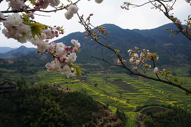 ????在觀景臺遠望,那是一幅夢境般的圖畫——群山環峙的村莊被綠黃色團團包裹,金黃色的花、白色的村落、青綠的山勾勒出一幅世外桃源美景。剛剛盛開的梯田花海,從山頂至山腳,從此山到彼山,沿著山坡層層疊疊,漫山遍野,蔚為壯觀。