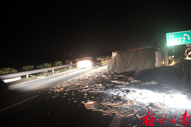 ????4月3日晚11時40分,梧貴高速公路往貴港方向約16公里處發生一起貨車側翻事故,車上貨物散落一地。