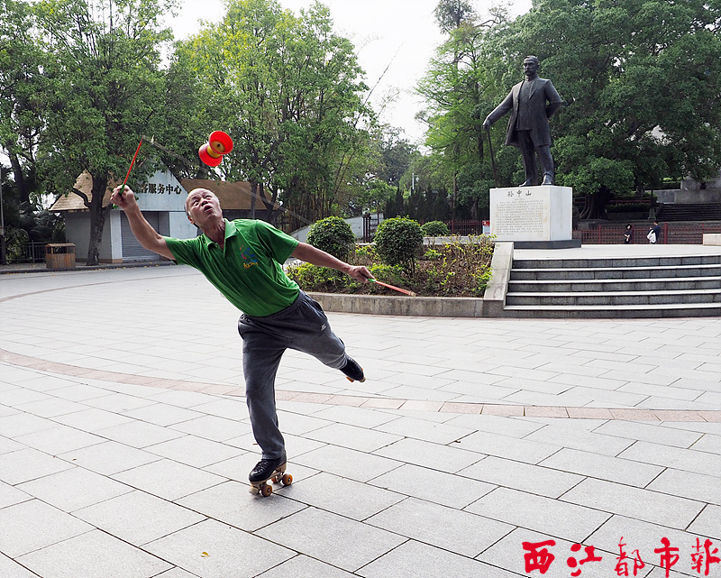 ????下午的中山公園孫中山紀(jì)念堂前,一位長(zhǎng)者一邊腳踩雙排輪一邊抖空竹,矯健的身姿讓一旁到此游玩的市民嘖嘖稱奇,更由衷地敬佩他老當(dāng)益壯的精氣神。這位長(zhǎng)者就是今年64歲的何金漢。