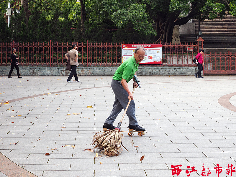 何金漢邊練習(xí)邊打掃場(chǎng)地,既鍛煉身體,又清潔環(huán)境。