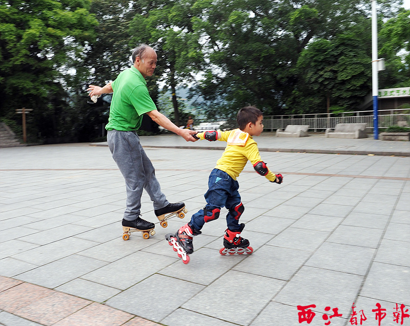 與小朋友一起玩滑輪,何金漢的靈活度絲毫不輸于小后生。