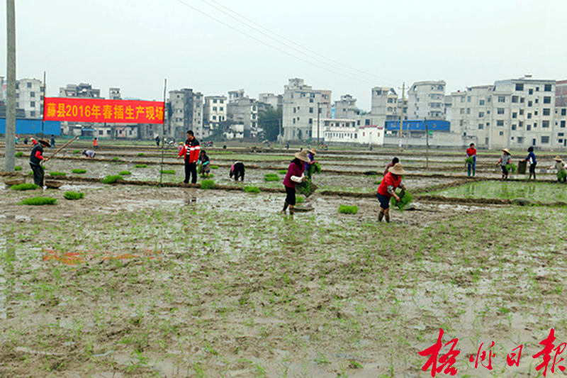 4月6日,在藤縣金雞鎮旺國村旺國垌組,村民正拋插秧苗。