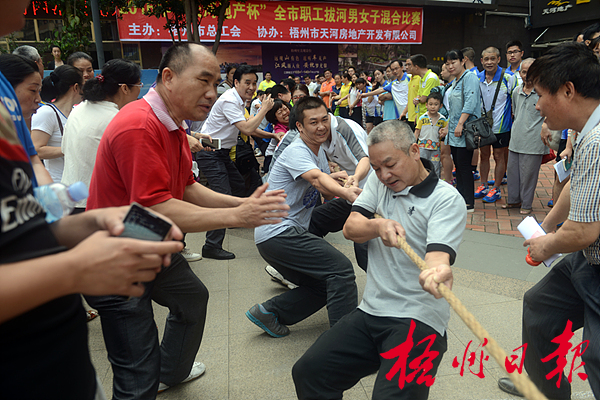4月16日,在山海觀廣場,梧州日報社隊正與對手角力。當(dāng)日,由市總工會主辦的“天河地產(chǎn)杯”全市職工拔河男女子混合賽拉開戰(zhàn)幕。此次比賽共有32支隊參加,以三局兩勝淘汰制決出名次。 李煜榮 攝