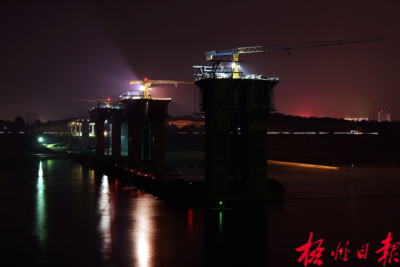 ????按照計劃,西江三橋主河橋要在今年底實現合龍。近期,施工單位加班加點加快施工,工地上夜間也是燈火通明,做到人員輪班、機械不停,全力搶抓工程進度(攝于4月11日晚)。