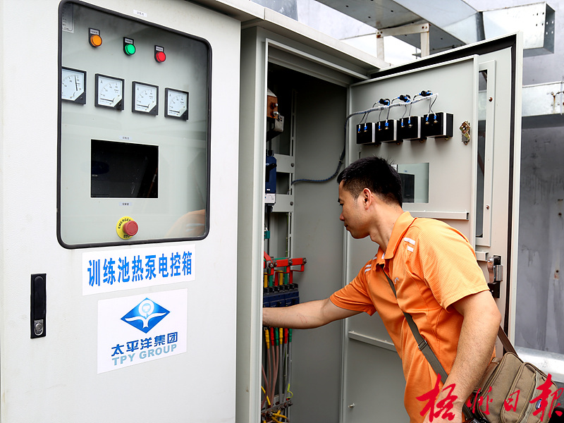 ????4月21日,在梧州市游泳(跳水)館天臺,工程師正檢查場館訓練池熱泵電控箱運行情況。