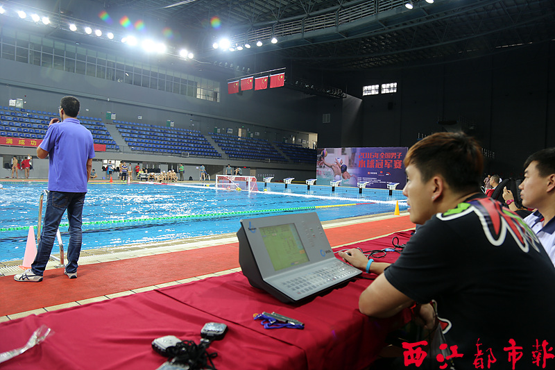 ????水球賽的后勤部工程師正在檢查計時計分設備。