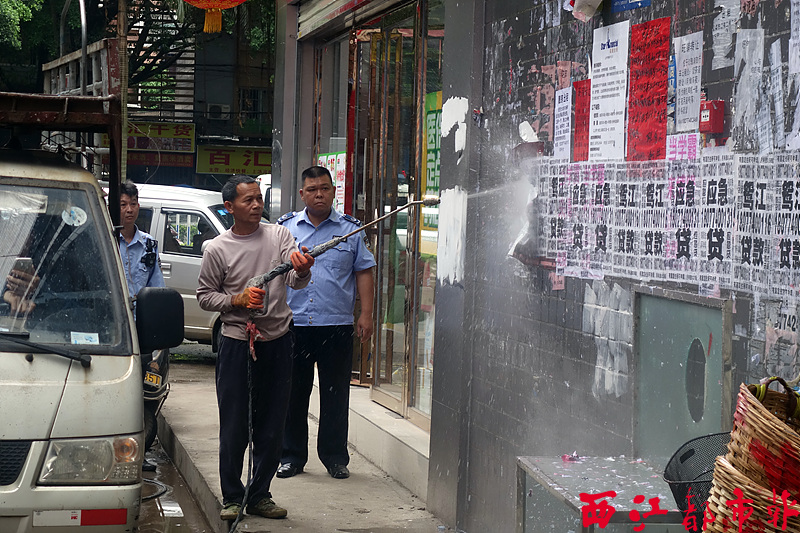 ??4月21日,長洲區(qū)城監(jiān)大隊(duì)安排人員對(duì)大塘市場周邊的“牛皮癬”進(jìn)行清理。西江都市報(bào)記者 龍?zhí)靷?攝