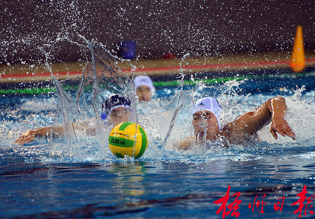 ????梧州日報訊 (記者 全淦枚) 4月22日,2016年全國男子水球冠軍賽在梧州市游泳館開賽,此次比賽時間為22日到27日,共37場比賽,來自國內外的9支隊伍同場競技,角逐冠軍。當天,一共舉行了8場比賽,進行的是A、B組預賽,各個隊伍按次序輪番上場競技。