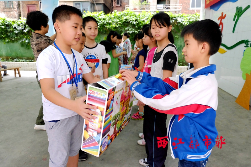 小記者學(xué)員將準(zhǔn)備好的小禮物送給特教學(xué)校的學(xué)生。