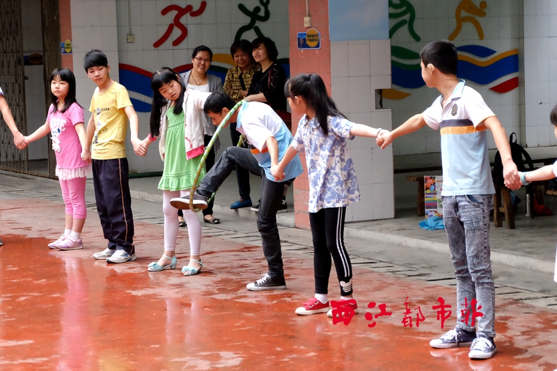 小記者學(xué)員和特教學(xué)校的學(xué)生一起手拉手玩鉆圈游戲。