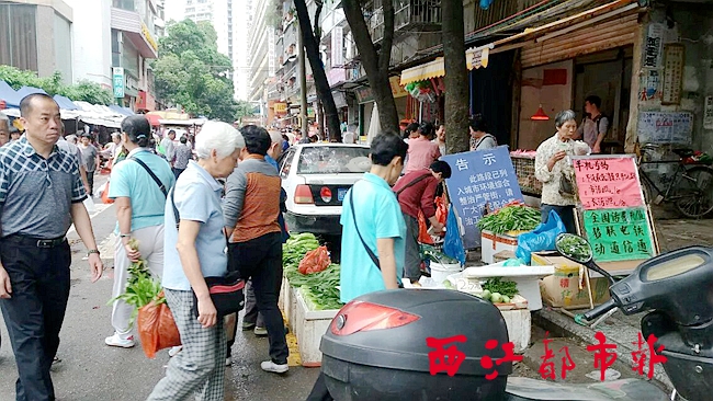 ????而市民練女士則認為,市場周邊環境秩序較差,這跟市民的消費習慣也有一定的關系:大家下班急著往家里趕,都有順路就近買菜的心理,于是,菜販們就根據這一需求,都到人流量多的沿街道路擺賣。正因為這樣,誰都不愿意到市場里面去,就連市場里面的攤主都把菜擺出路邊。因此,每天下班時間段,就是現場秩序最混亂的時候。尤其傍晚,在怡景酒店對出路口,車流、人流、商販之間展開“拉鋸戰”,常常導致嚴重的交通堵塞。