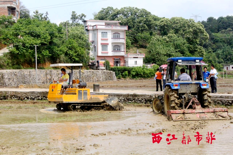 日前,在慶偉公司租賃的水稻田里,村民正操作農業機械進行耕種。