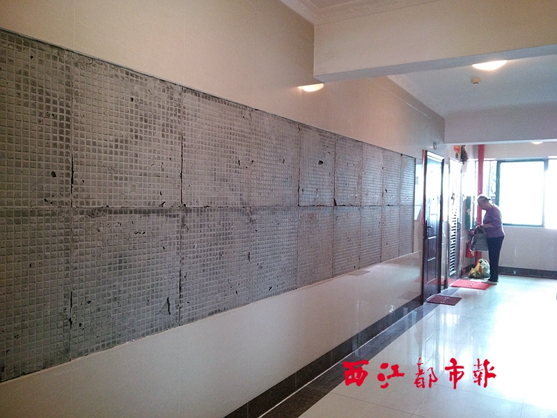 ????陳老伯表示,應該是在今年的2月初,14樓的瓷磚出現脫落情況,但幾個月過去了,該樓層樓道瓷磚脫落的地方至今未修補。物業管理方表示,墻上的瓷磚之所以出現脫落,是因為天氣原因,瓷磚出現熱脹冷縮。如果要對這些墻體進行修補,需要該樓層8家住戶共同籌資解決。“我們搬來這里才3年時間,就出現了這樣的問題,而且我們并沒有對墻上的瓷磚進行故意破壞,為何要住戶出錢維修。”陳老伯表示,希望有關單位能盡早對瓷磚脫落的地方進行修補,并排查存在安全隱患的瓷磚,重新進行修補,保障住戶安全。