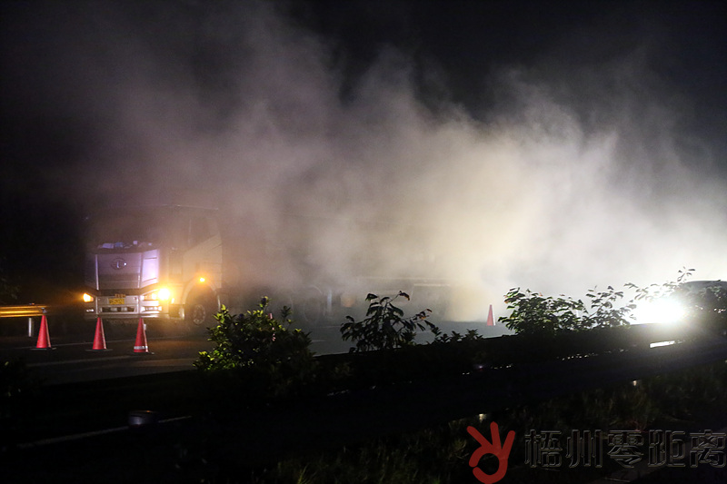 ????梧州零距離網訊 2016年5月2日18時55分,梧州市消防支隊指揮中心接到110轉警:蒼碩高速梧州往貴港方向一公里處一輛裝有28噸硝酸的槽罐車發生泄漏事故。接警后,梧州支隊立即調派特勤中隊3輛水罐車、1輛搶險救援車32名官兵趕赴現場救援,藤縣中隊1輛水罐車、1輛搶險救援車12名官兵前往增援。