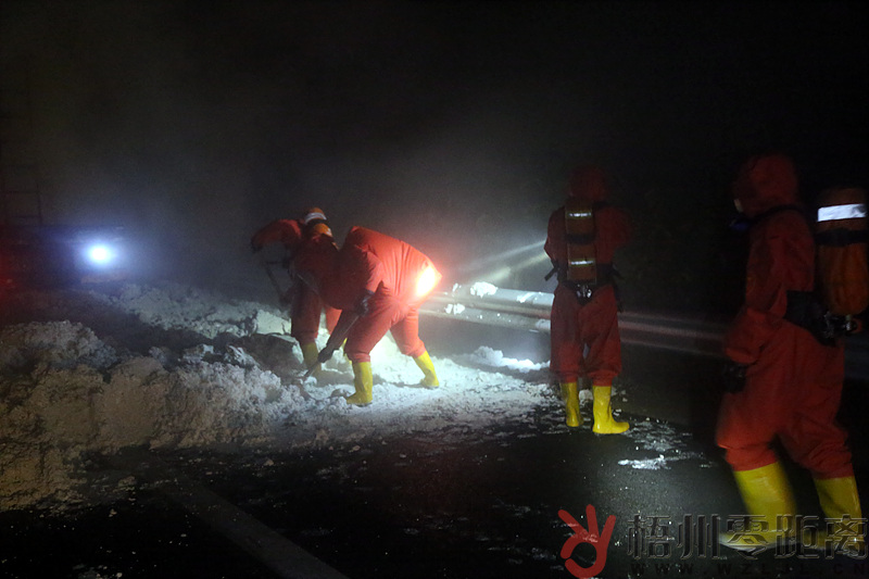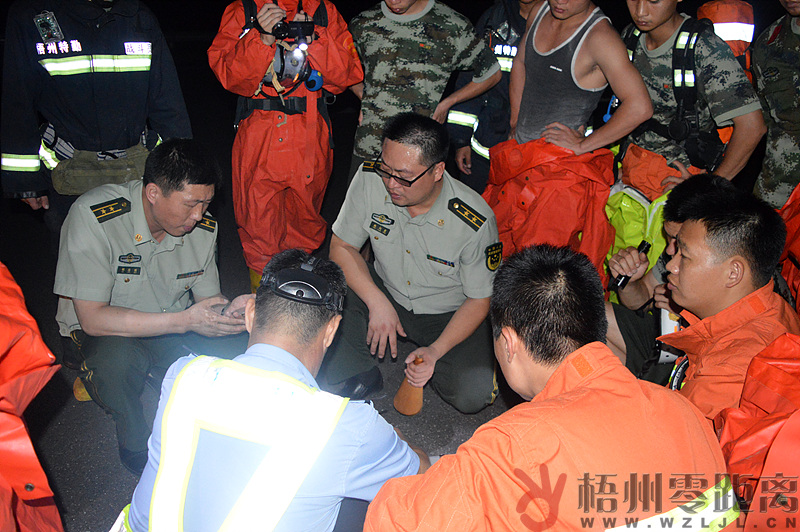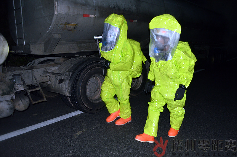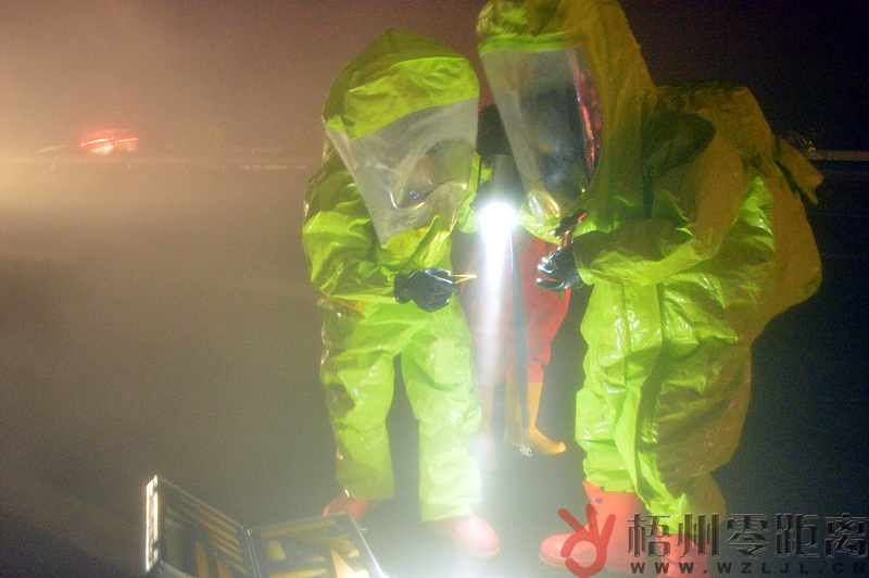 ????19時40分,特勤中隊到達現場,經過偵查發現:一輛裝有28噸硝酸的槽罐車罐底發生泄漏,泄漏量較大。19時50分,支隊全勤指揮部和增援的藤縣中隊相繼到場。現場指揮員一邊安排人員對現場進行警戒,一邊組織人員對泄露罐體進行堵漏。特勤中隊官兵身著防護服與技術人員前往事故車輛對泄漏點堵漏,由于泄漏點位于槽罐車后方且泄漏口形狀不規則,經過多次嘗試堵漏不成功。為了防止污染面積進一步擴大,消防官兵在路邊挖坑引流,防止硝酸四處擴散。