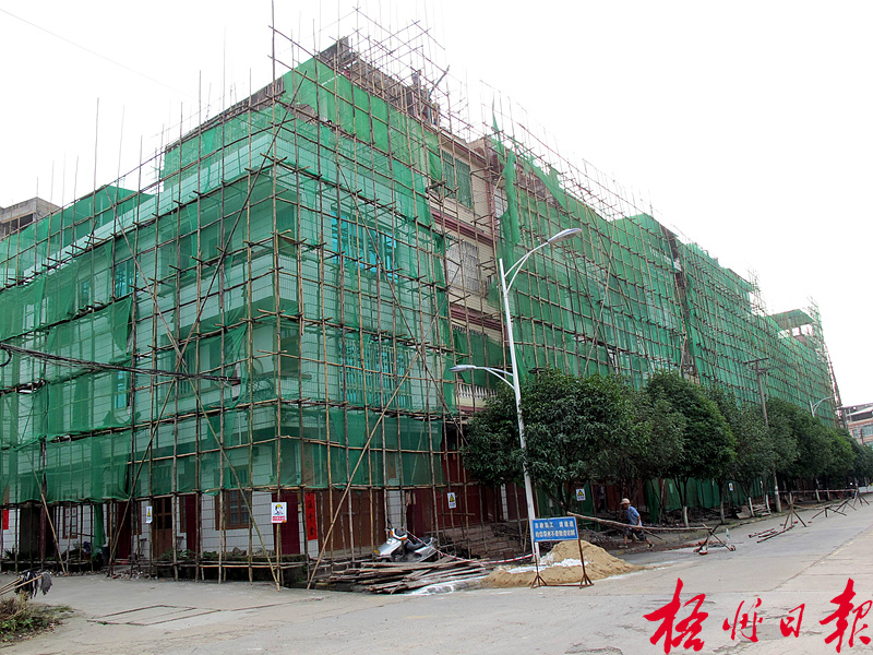 ????日前,蒙山縣啟動(dòng)實(shí)施永安街風(fēng)貌改造工程,工人在沿街房屋搭建腳手架準(zhǔn)備施工。
