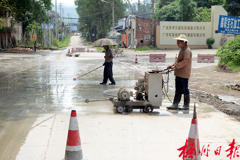 ????5月4日,在蓮花山路,工人正在鋸刻路面,清洗道路。