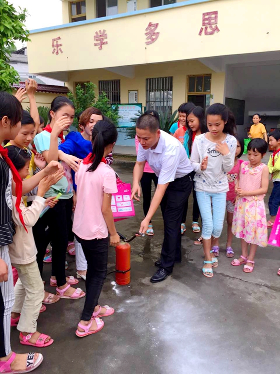 青年志愿者現場教會小學生們如何正確使用滅火器。