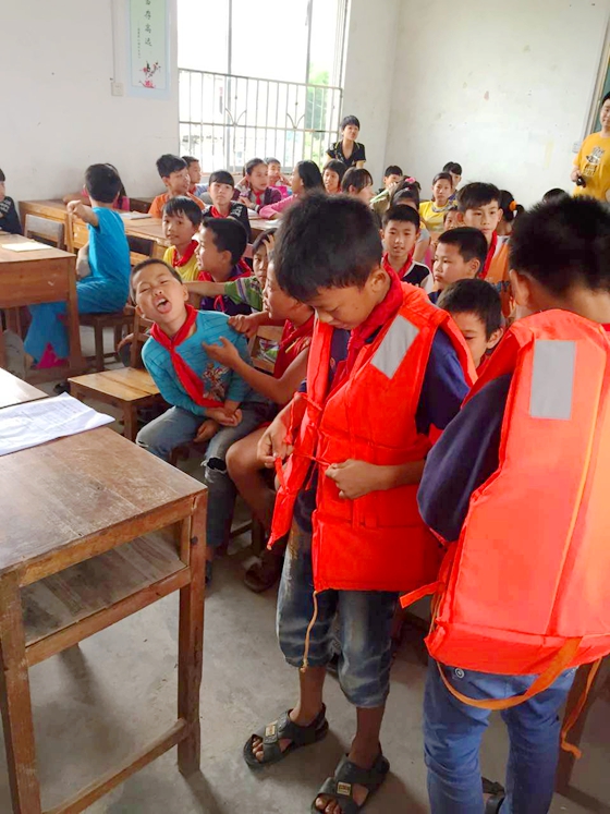 ????藤縣濛江泗洲島是一個四面環水的江河小島村落,村里的人們出入只能通過水路,泗洲島小學共有學生約200人。前期,經過與該校老師的細致溝通,本次水上交通安全課選擇在五、六年級的學生中開展,志愿者們重點通過真實的水上交通事故案例,警醒與教育小學生們水上交通安全的重要性,并借此深入為學生們介紹水上交通知識和基本的救生技巧,包括如何自救、小朋友如何求助并救助落水人員、乘船過程注意事項和禁止的行為、人工呼吸和心肺復蘇等救生技巧等。青年志愿者們更是親自參與,現場手把手地教會學生如何正確穿戴救生衣,以及如何正確使用滅火器等安全技能。