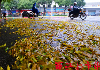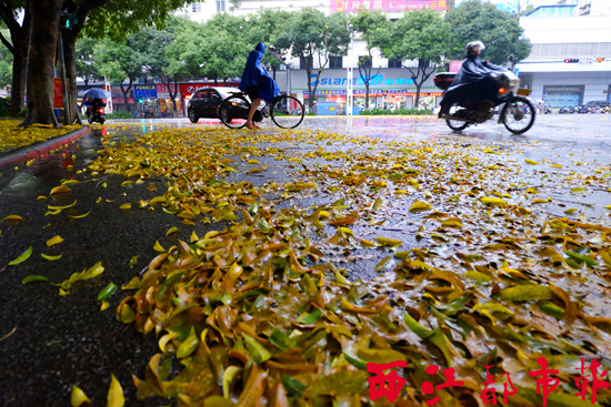 5月6日,大雨過(guò)后,行人從鋪滿(mǎn)仁面樹(shù)的地面走過(guò)。春夏之交,晝夜溫差較大,種植在新興一路沿線的仁面樹(shù)紛紛落葉,加上強(qiáng)降雨的影響,打落的大量樹(shù)葉營(yíng)造出一片金黃色的人行道,為雨后出門(mén)的行人呈現(xiàn)出短暫的美景。?西江都市報(bào)記者?何鎏/攝