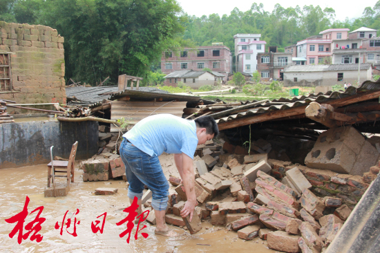5月7日,蒙山縣文圩鎮河村村受災戶在對倒塌的房屋進行清理。江永錄 攝