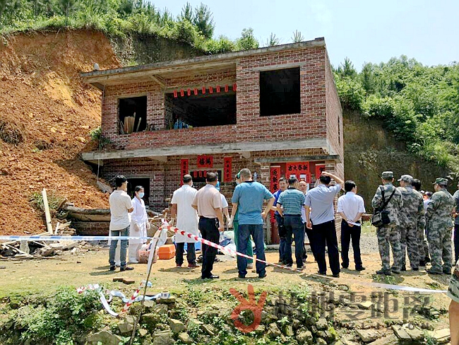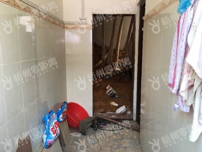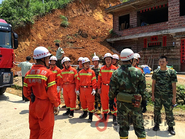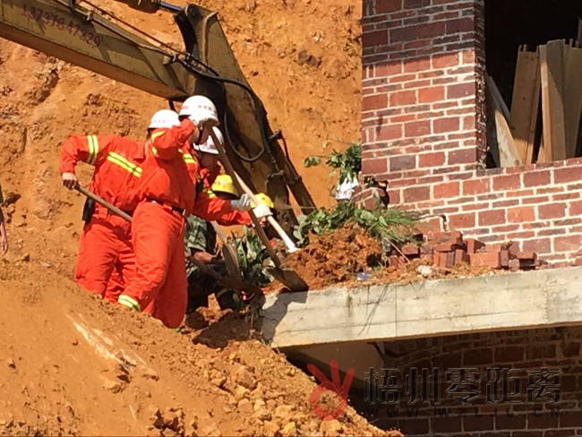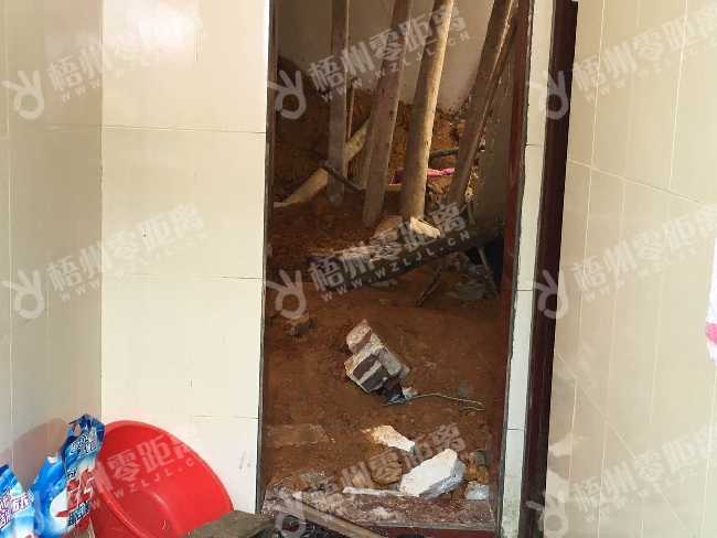 ????據梧州消防支隊負責人覃楚明介紹,今天上午消防隊員到達現場后第一時間劃出警戒線并進行搜救,在現場搜救發現,受災房屋一樓靠山邊房間的墻壁已被擊穿,其中一間房被泥土沒入大半,另一間房內三分之一空間也被泥土填充,消防人員只能用樹枝支撐剩余的墻體,預留救援空間,二樓房間也有部分泥土進入。
