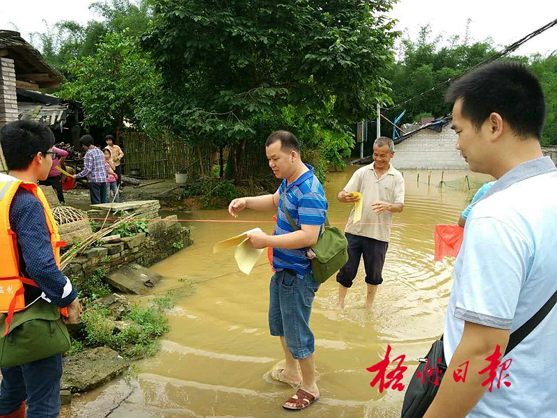 5月9日,倒水鎮抗洪工作組工作人員向村民發放防汛緊急告示,提醒群眾注意汛情、及時避險。 陸敏 攝