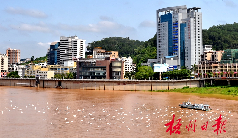 ??? 5月12日,在云龍大橋附近,一群白鷺在西江江面上翱翔。