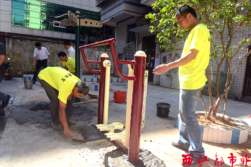 當天,社區組織專業施工人員安裝健身器材,方便小區居民戶外鍛煉。 西江都市報記者 蒙紹松/攝