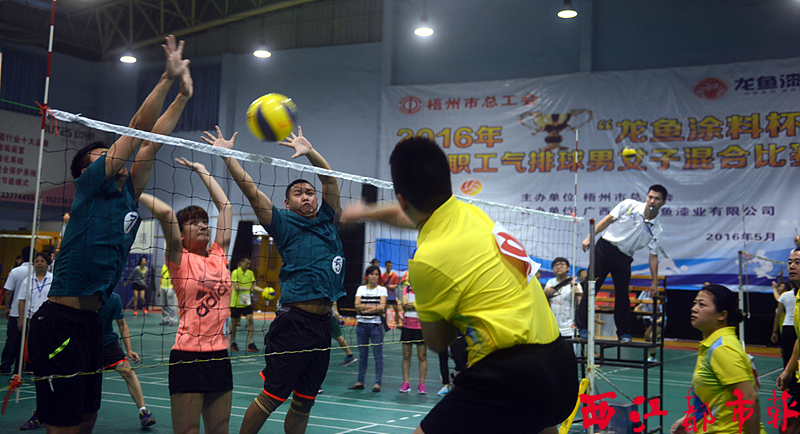 5月13日,在梧州市工人體育館,梧州供電局隊與市體育局隊在氣排球比賽中展開激烈較量。當日,由市總工會主辦的2016年“龍魚涂料杯”全市職工氣排球男女子混合比賽開賽,全市共有75支球隊參加為期兩天的比賽。 李煜榮/攝