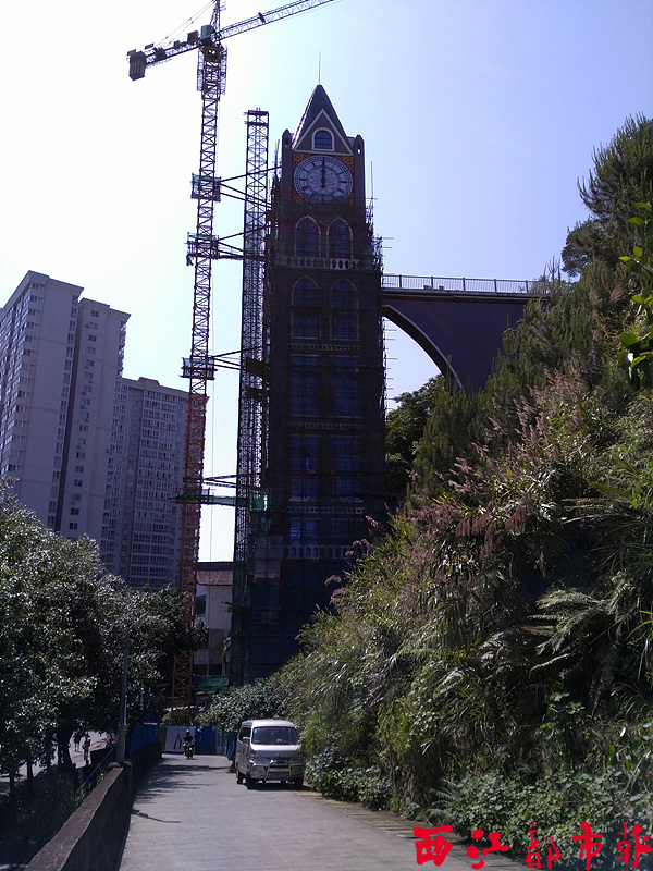????目前,珠山上山電梯塔樓頂端的時鐘造型已完工,一條長長的人行天橋連接著塔樓與山體。吳艷虹/攝