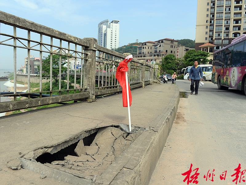 ????云龍大橋北橋頭人行道一處水泥板斷裂粉碎,下陷形成一個坑(攝于5月17日)。目前,已有人在下陷處插了一根塑料桿作警示,但晚上行經此處還是十分危險,希望有關部門能盡快修復,保障行人安全。