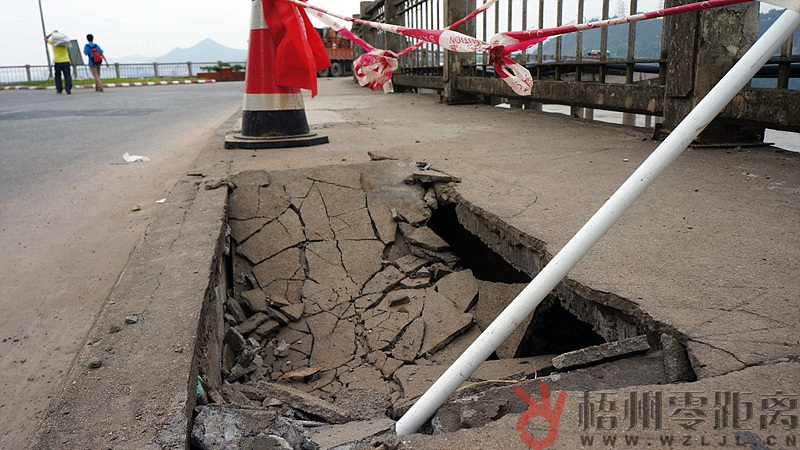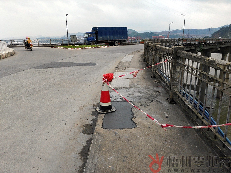 ????梧州零距離網訊 5月17日,市民報料稱云龍大橋人行道上出現塌陷,5月18日早上,記者到云龍大橋實地走訪。
