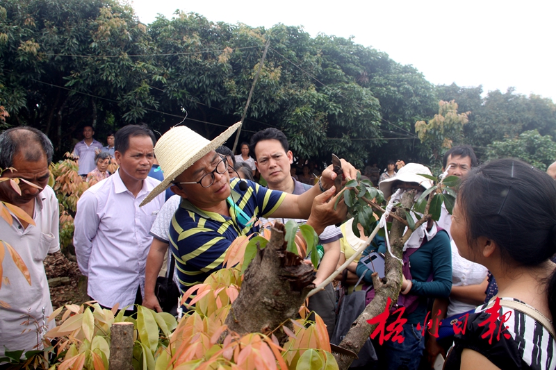 ??? 5月23日,在藤縣濛江鎮(zhèn)健良村荔枝、龍眼種植基地,水果技術(shù)人員正在給果農(nóng)講解荔枝高接換種技術(shù)。