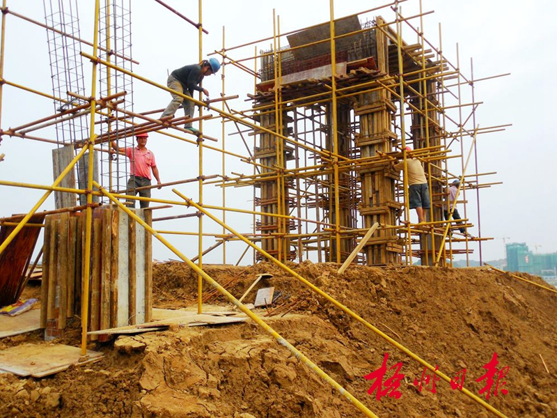 ????5月23日,在藤縣縣城河東防洪堤1號標段工地,工人們正捆扎水閘房框架鋼筋。