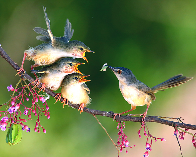 《哺育》獲首屆全國職工攝影大展優秀獎,拍攝于2014年7月,一個影友說在一個鄉村發現一窩小鳥,當時小鳥可以走出鳥窩,但不會飛,不能走遠,我去等候了大半天,抓拍到了小鳥走出鳥窩,在附近樹枝上爭相等母鳥喂食的精采瞬間。