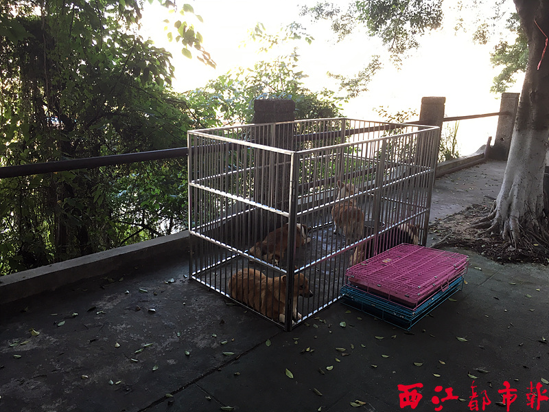 店家將犬只和狗籠安置在人行道上。 李玉瑩/攝