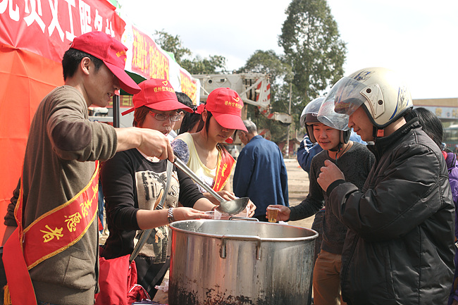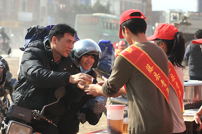 志愿者把熱茶送給回鄉農民工。