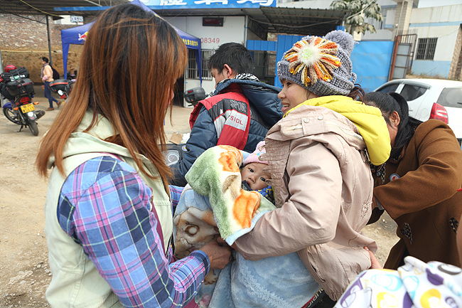 黨員志愿者為年輕媽媽解開要上的背帶。