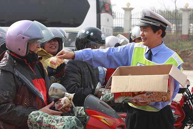 交警叔叔把包子送給農民工。