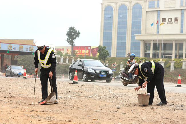 交警趁摩托車少的間隙親手清理現場垃圾。