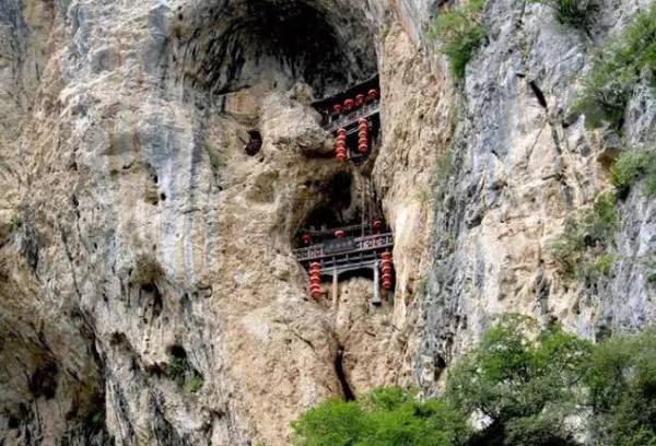 ????亮點:利用自然巖溶地貌,巧妙地把廟宇鑲嵌在懸崖上的溶洞縫隙中,可與恒山懸空寺媲美。