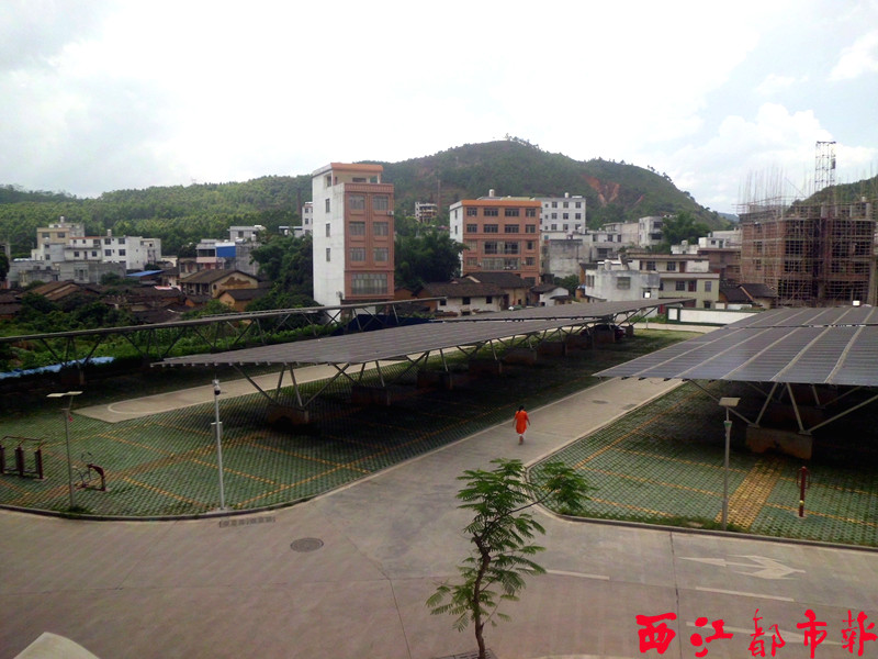 岑溪市文體中心停車棚太陽能光伏電站一角(攝于5月30日)。這個利用停車場建設的光伏電站,裝機容量為1000千瓦,年發電量約128萬千瓦時。