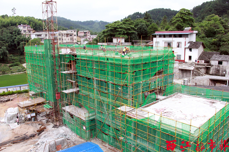 6月3日,蒙山縣新圩鎮貌儀小學新教學樓建設工地上,工人在緊張施工中。