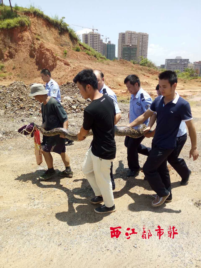6月6日,在藤縣縣城一工地,居民發(fā)現(xiàn)一條長達(dá)3米的大蛇。藤縣警方接警后和附近群眾合力將大蛇搬離現(xiàn)場并移交森林公安部門。經(jīng)初步鑒定,這條長達(dá)3米、重約20公斤的蛇為國家一級重點(diǎn)保護(hù)野生動物蟒蛇。 周慶肇/攝