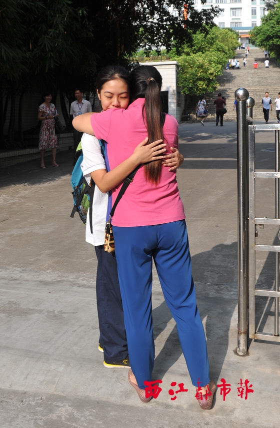 家長以一個溫暖的擁抱作為對考生的鼓勵。 西江都市報記者 陳健新/攝