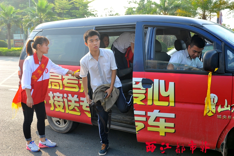 6月7日,在梧州高中門前,志愿者迎接由“黃絲帶”車輛送來(lái)的考生。 西江都市報(bào)記者 何鎏/攝