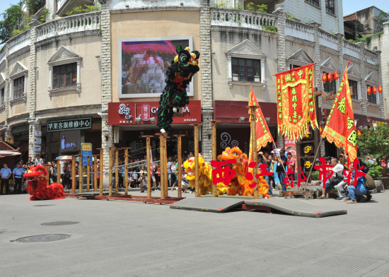 嶺南風情一條街開街表演中展示的傳統舞獅技藝贏得觀眾陣陣掌聲。記者 陳健新/攝