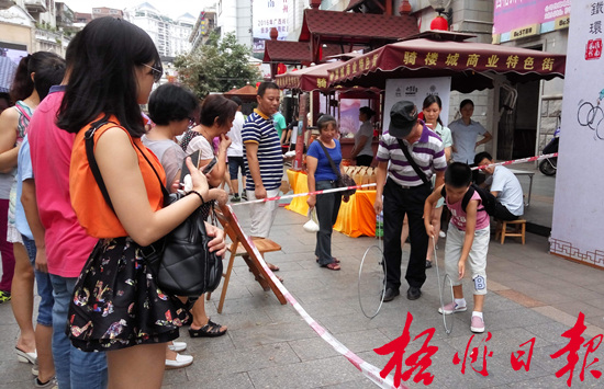 6月9日,在嶺南風情一條街,市民游客正體驗滾鐵環游戲。?李欣鞠?攝